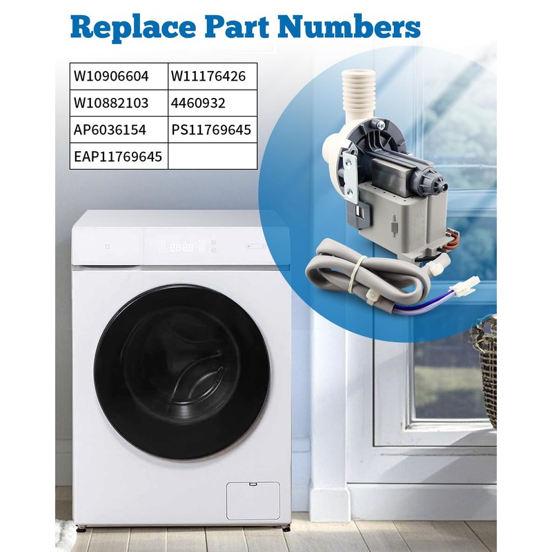 - Replacement part code of washer machine pump: W10906604, W11176426, W10882103, 4460932, AP6036154, PS11769645, EAP11769645