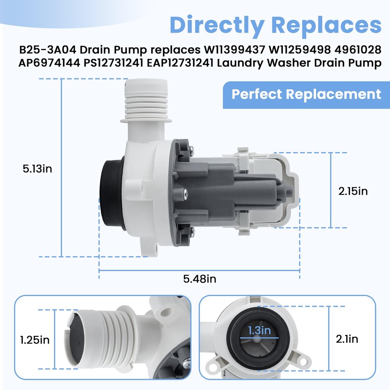 - Directly Replaces: B25-3A04 Drain Pump replaces W11399437 W11259498 4961028 AP6974144 PS12731241 EAP12731241 Laundry Washer Drain Pump. This heavy-duty drain pump ensures fast, efficient water removal with minimal noise. Built with a durable corrosion-resistant motor and robust impeller, it handles high-volume drainage without clogging. Precision-engineered for meet OEM standards, it delivers reliable performance under frequent use
