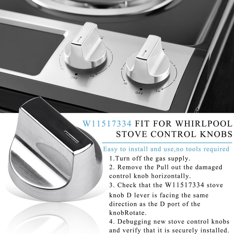 - GAS STOVE KNOB: The gas stove knob is made of high-quality stainless steel and has a hard texture. The W11517334 gas stove knob has undergone rigorous factory testing and can meet your usage needs. W11517334 gas stove knobs have the advantages of corrosion resistance, high temperature resistance and durability. Compatible with whirlpool stove knobs replacements W11517334 brings you a convenient life.