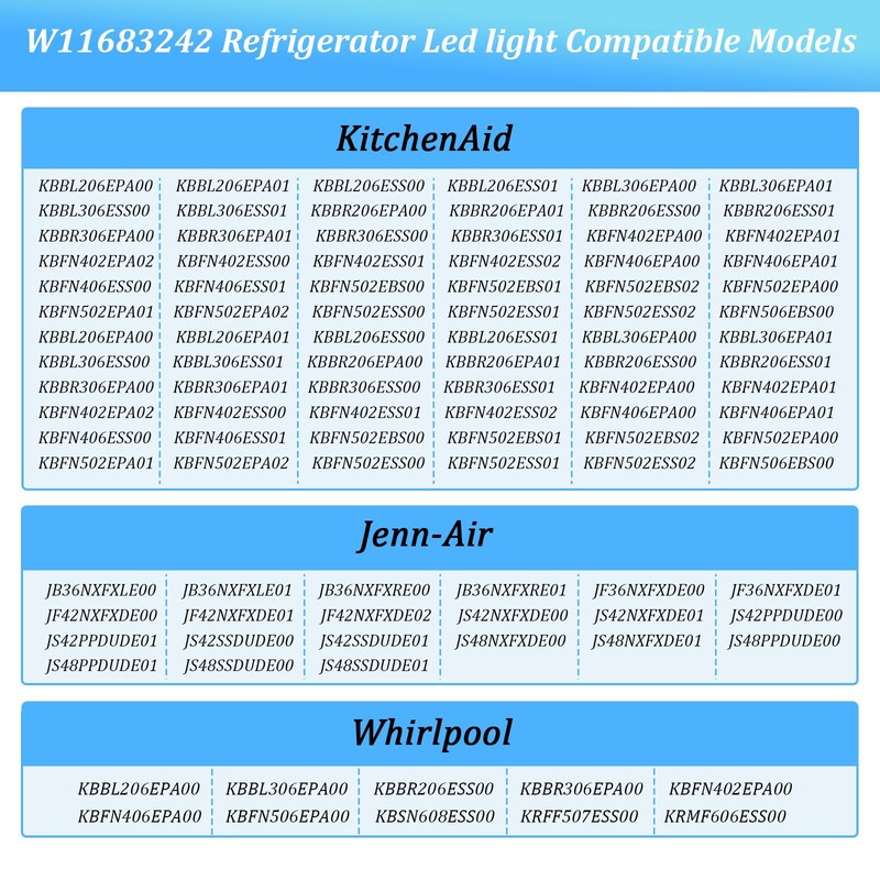 - 【The Whirlpool W11683242 Refrigerator light Assembly Kit is a premium solution to illuminate the interior of your refrigerator】 This set includes 12 light modules, providing bright and even lighting. Designed for select Whirlpool JennAir and KitchenAid refrigerators, it ensures a perfect fit and optimal performance.