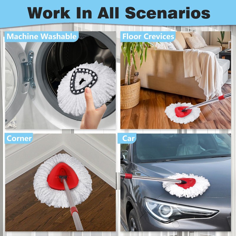 - 【MULTIPURPOSE MOP HEAD】The microfiber spin mop refill uses the power of microfiber to give your floors a deep clean. For dry and wet use.The triangular and hard bristled scrubber allows you to clean various surfaces, including bathroom tiles, bathtubs, shower tiles, kitchen floors.