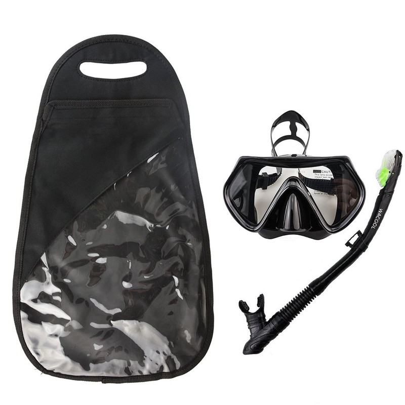 WACOOL Professional Adults Teens Kids Snorkeling Snorkel Diving Scuba Package Set with Anti-Fog Coated Glass Purge Valve and Anti-Splash Silicon Mouth Piece for Men Women (Adults,Black)