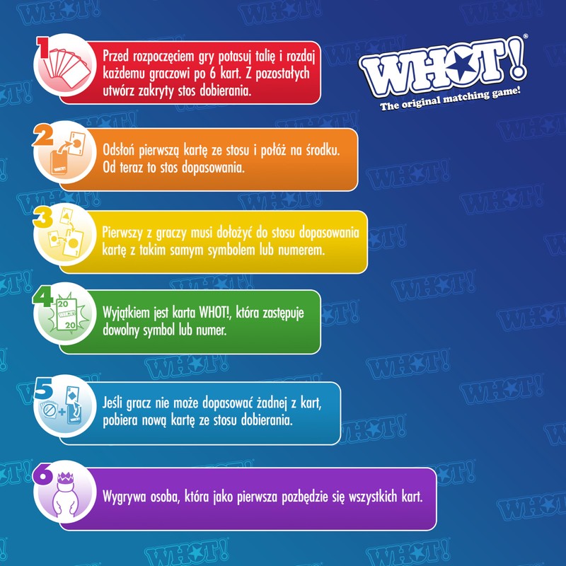 - Dies ist ein Kartenspiel für zwei bis sechs Spieler. Jeder Spieler erhält 6 Karten und muss die Formen oder Zahlen auf dem Stapel in der Mitte übereinstimmen. Spezielle WHOT-Karten! Joker arbeiten Ziel ist es, als Erster alle deine Karten loszuwerden.