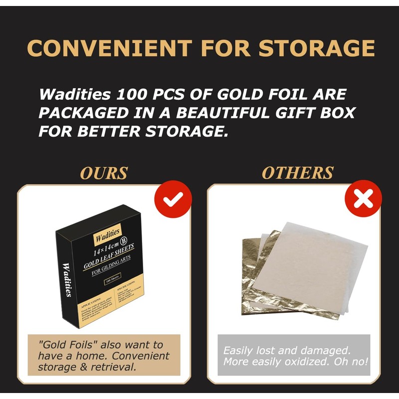 - [Beautifully packaged]: All 100 sheets of gold leaf are separated by thin white tissue to protect them from damage and wrinkles. Our carton packaging is resealable for easy storage and reuse.