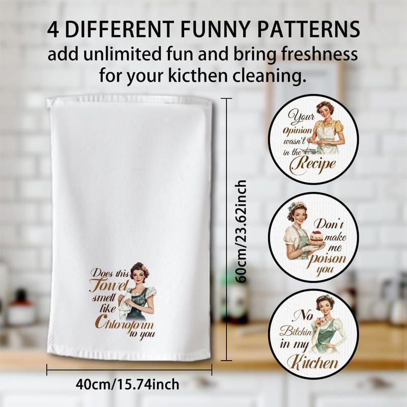 - 4 different styles: you will receive 4 pieces of our housewife kitchen towels in 4 different styles, 1 piece / style, the size is approx. 40 cm (15.7 inches) in width, 60 cm long, practical styles and matching sizes can meet your different needs, liven up your table and bring you a good mood