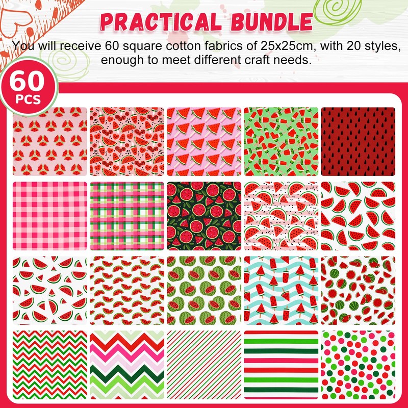 • 【Vibrant and Diverse Quilting Fabrics】: Presented in a package of 60 pieces, these magnificent multicolor watermelon fabrics offer an array of patterns to choose from, such as watermelon, stripes, Polka Dot and check