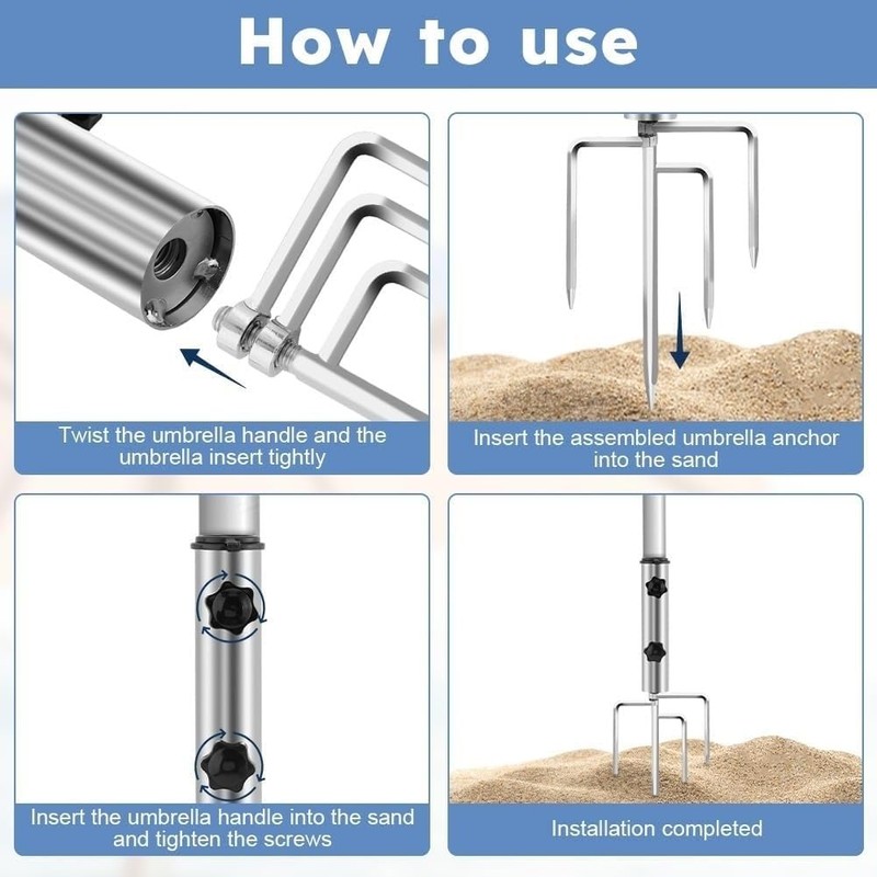 This beach umbrella anchor is made of high quality iron, strong and durable, not easy to rust. It is designed with 4 landing points to provide stable support for your beach umbrella, suitable for use in a variety of outdoor activities.