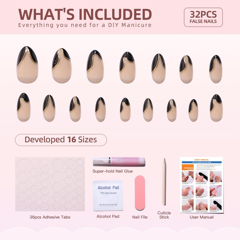 - What's Included: 16 nail sizes - 32 pieces ensure a totally personalised fit, plus we give you everything you need just in case! Each set comes complete with a storage box, nail glue, adhesive tabs, double sided nail file, cuticle stick and prep pad.