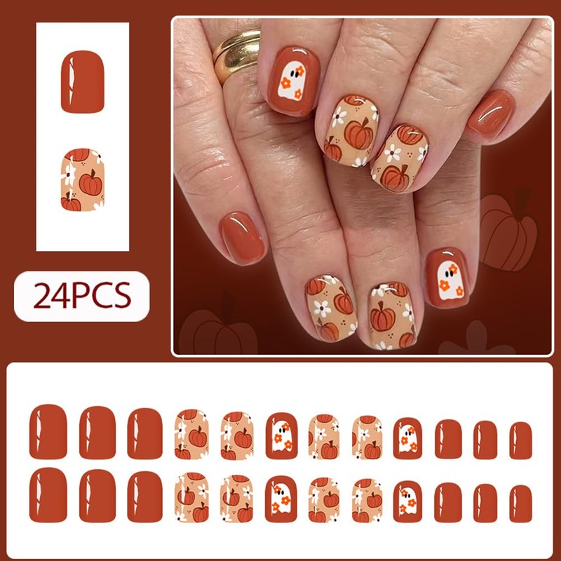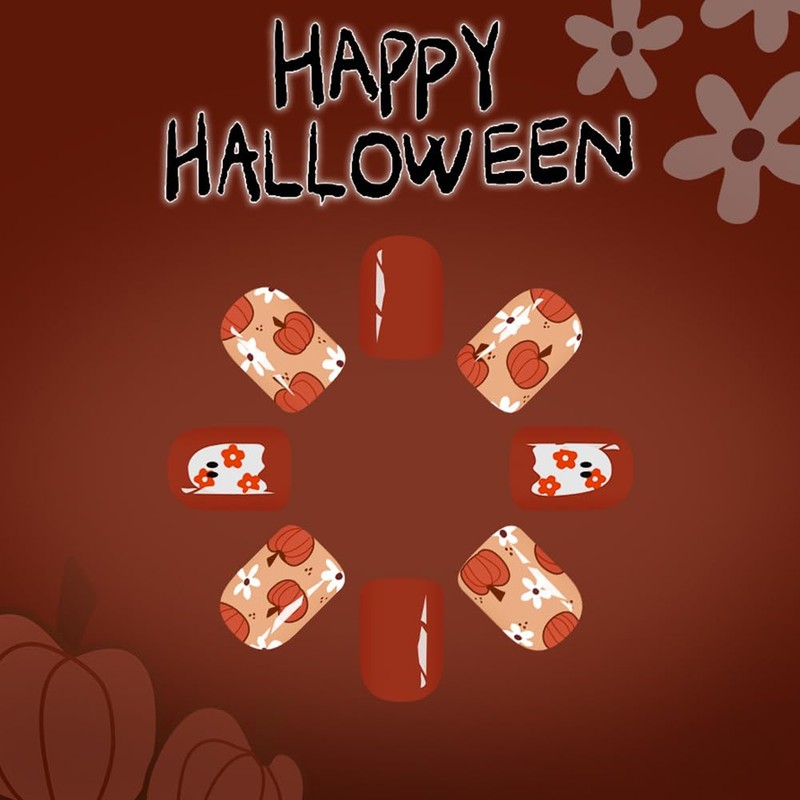 WAFOLOZE Halloween Press on Nails Short Square Fall Fake Nails with Orange Pumpkin Cute Ghost Flowers Glossy Design, Artificial False Nails Press Ons Glue on Nails For Women