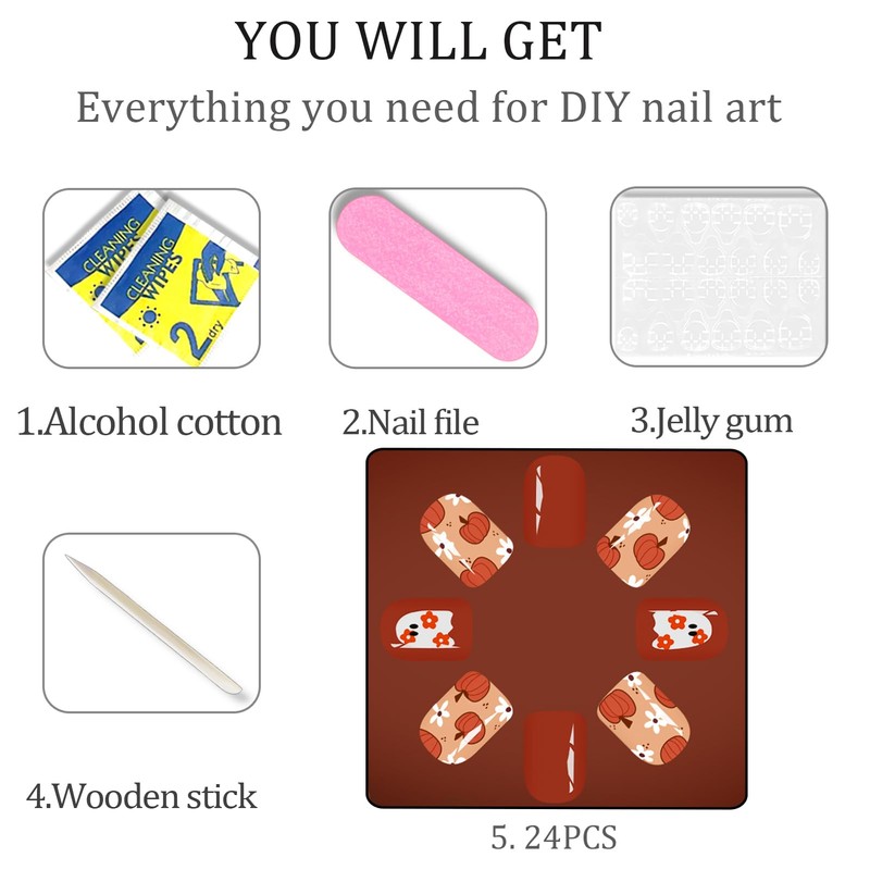 • 【Press Ons Package】- 24 pcs/12 sizes Halloween nails, 1 cleaning cloth,1 nail file, 1 stick wooden stamp, 24pcs jelly glue. (Please use Your own nail glue when wearing for 7-14 days).