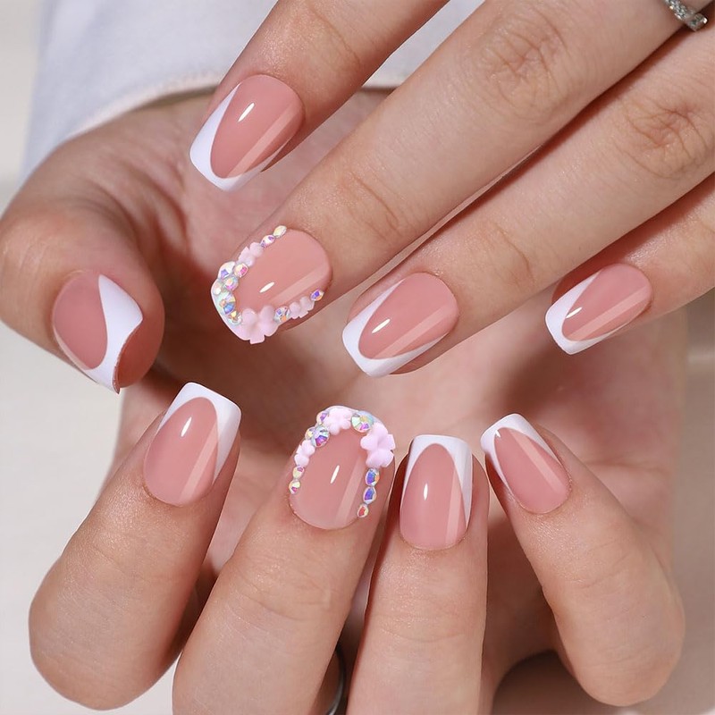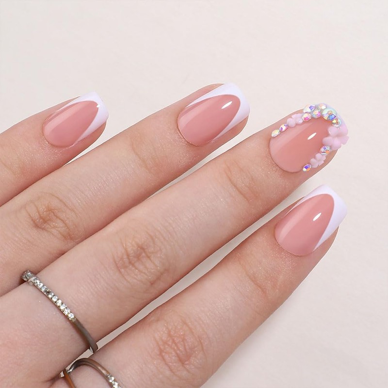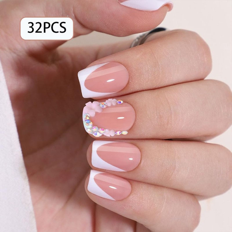 WAFOLOZE White French Tip Press On Nails - Short Square Press On Nails, Fake Nails with Rhinestone and Flower Design, Artificial Nails 16 Sizes - 32Pcs False Nails Tips Kit, Stick On Nails for Women