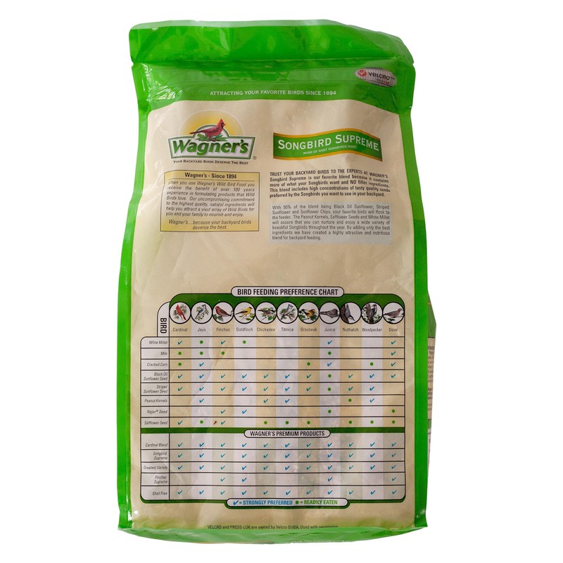 Wagner's Songbird Supreme has more of what songbirds want. Songbird Supreme is our favorite blend because it contains more of what your songbirds crave. This blend includes high concentrations of tasty quality seeds preferred by the songbirds you want to see in your backyard. With 50% of the blend being black oil sunflower, striped sunflower and sunflower chips, your favorite birds will flock to the feeder. The peanut kernels, safflower seeds and white millet will assure that you can nurture and enjoy a wide variety of beautiful songbirds throughout the year. By adding only the best ingredients we have created a highly attractive and nutritious blend for backyard feeding. Trust your backyard birds to the experts at Wagner's.