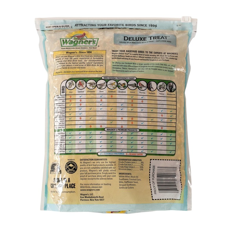 Wagner's Deluxe Treat Wild Bird Food is a deluxe wild bird food with a treat - safflower seed. Wagner's Deluxe Treat is a quality blend of seeds including black oil sunflower as well as different varieties of safflower seed. This colorful high quality blend will bring all your favorite and beautiful songbirds to your backyard. By offering your backyard birds a larger quantity of the seeds they enjoy, you will be rewarded with many different types of songbirds that will come to your feeders. Cardinals, Chickadees, Titmice, Nuthatches and Jays will be frequent visitors to your backyard. This blend works well in all types of feeders. Trust your backyard birds to the experts at Wagner's.