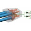 This pushwire connector allows you to connect two wires together in a way that minimizes contact with the live ends of the wires.