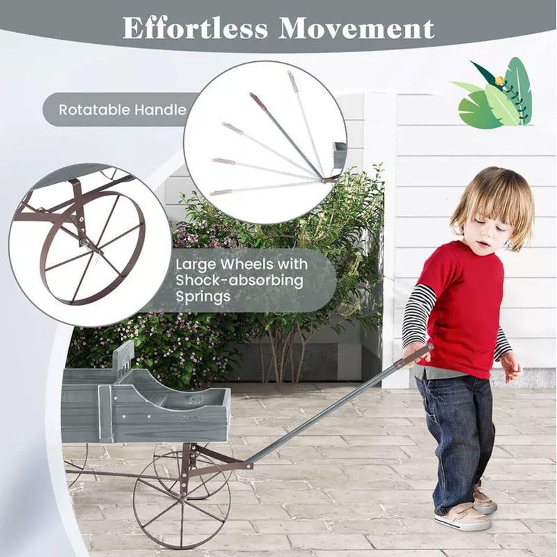 Wagon Planter, Decorative Wooden Garden Planter with Wheels, 2 Planting Sections and Adjustable Handle, Indoor Outdoor Backyard Balcony Decor (Grey)