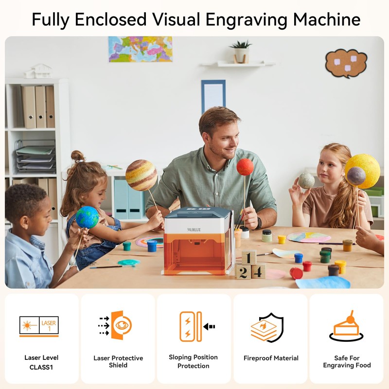 - [Safety protection]WAINLUX K10 3000mW is the Laser Class 1 laser engraver. The safety protection design of the micro-opening induction shield is equipped with an anti-laser see-through window, a blue light filter rate of 99.7%, and a visual design of the internal engraving progress without goggles. When the shield is opened, the machine stops working. Movement Protection, Overheating Monitoring, and built-in fireproof engineering plastic to protect your safety in all aspects.
