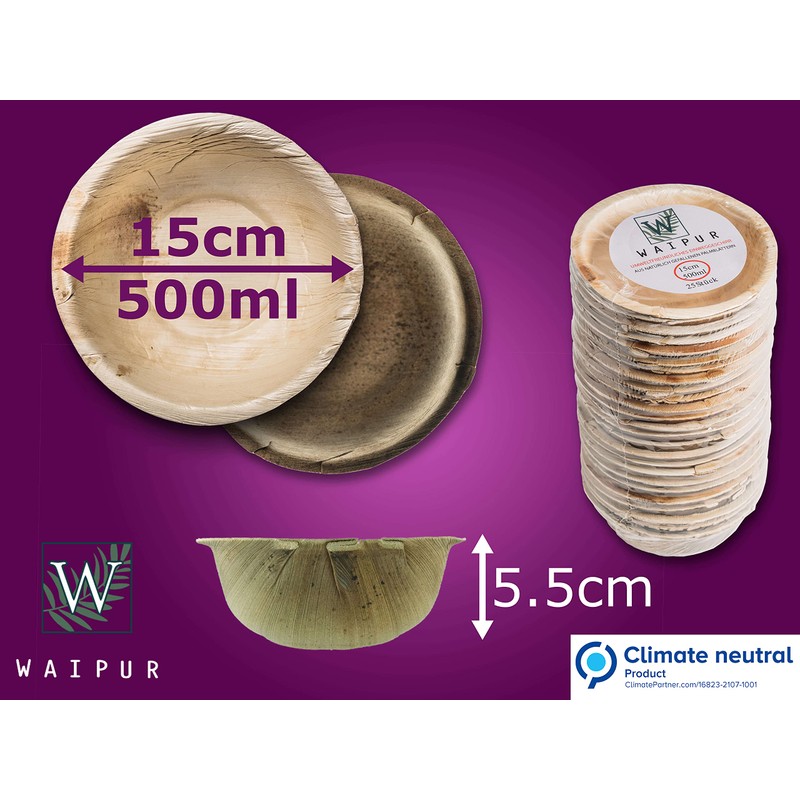 Waipur Organic Palm Leaf Bowls - 25 Large Bowls Diameter 15 cm / 500 ml - Premium Disposable Tableware Compostable - Soup Plates Similar to Bamboo Disposable Bowls