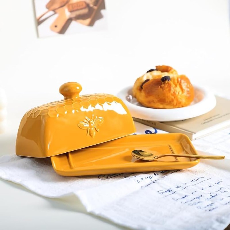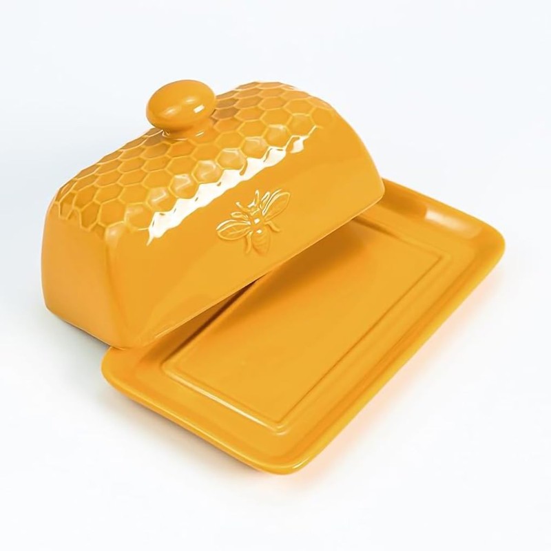 WAIT FLY Ceramic Butter Dish with Lid Honeycomb and Bee Butter Container Butter Tray Butter Keeper for Kitchen Countertop