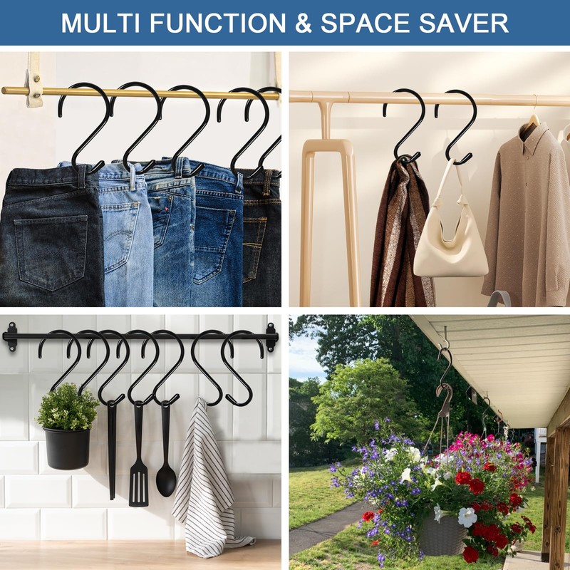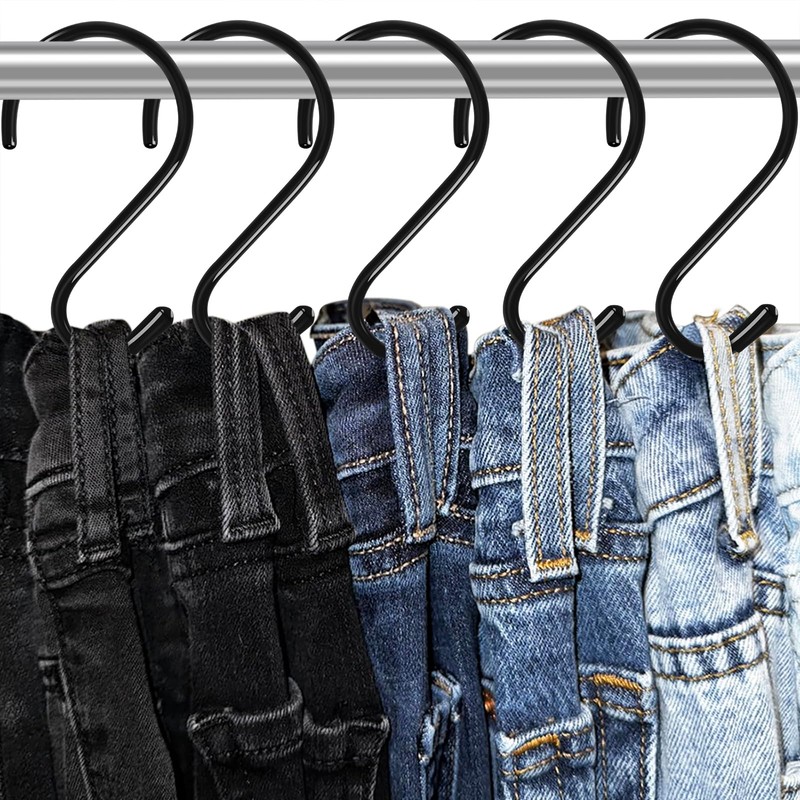 - Multipurpose S Hooks: These s hooks are great for hanging your clothes, jeans, scarves, hats, belts in the closet. You can also use s hooks for hanging pots, pans and other kitchen utensil on your pot rack. Also useful to hang towels and robes in the bathroom, and organize tools in the garage, and hang plants in your garden.