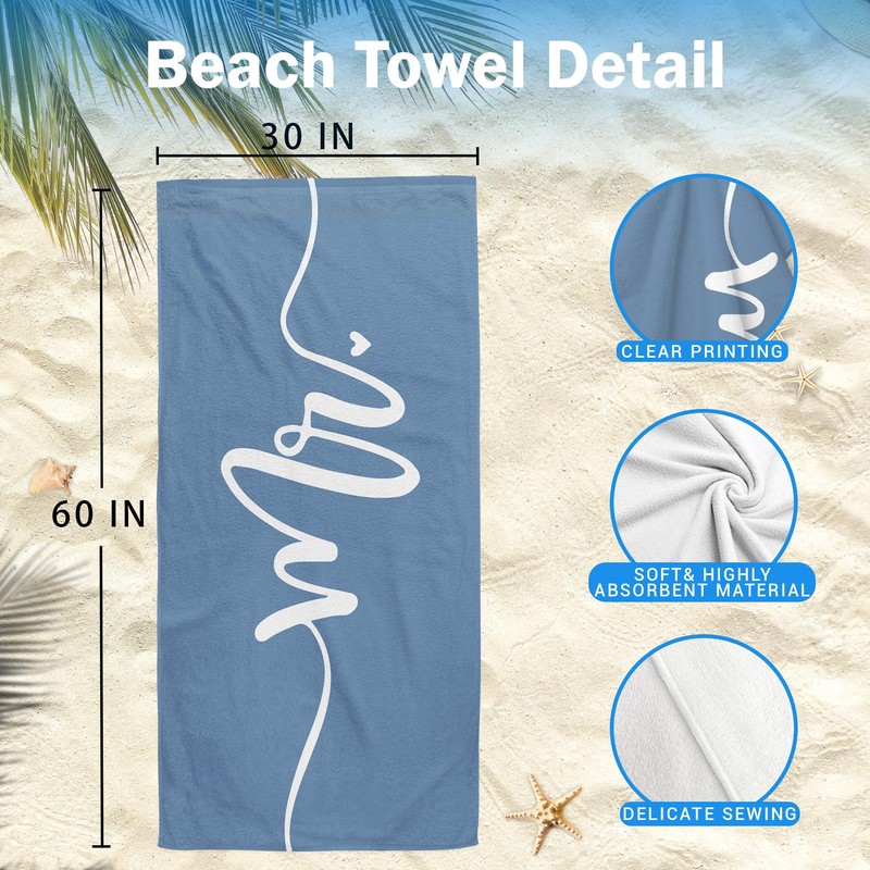 WAITPI Mr and Mrs Beach Towel Set of 2, Honeymoon Wedding Beach Towels Gifts for Newlywed Couple Bride Groom Valentines, Pink and Blue Towels Oversized Decor for Bathroom 30x60 in