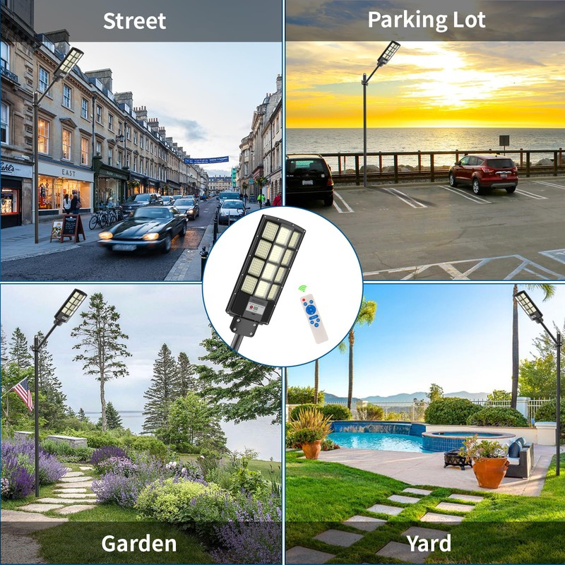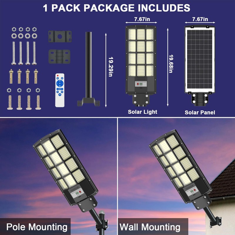 - [ Higher Quality ] This 1500W solar light is equipped with 180 LED beads to provide bright and clear 200000LM 6500K daylight, and the 3-way panel's super wide angle lighting design can cover more than 2000 sq ft to ensure safety. Also the solar street lights outdoor use a stable and long-lasting solar lithium battery without any electricity bill