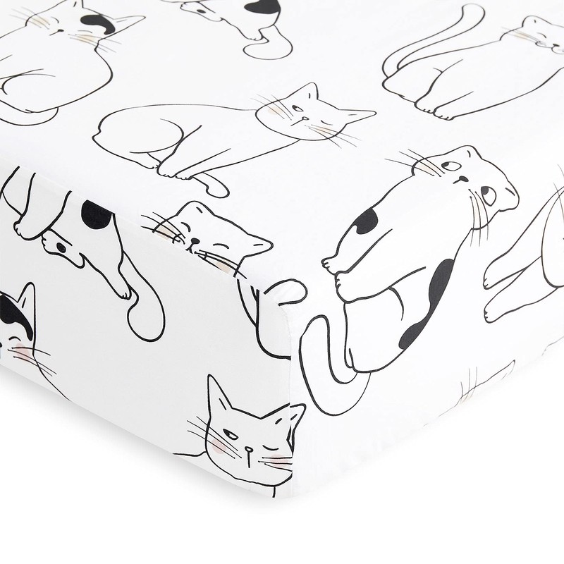 Wake In Cloud - Cats Bed Sheets, 100% Cotton, 4-Piece Sheet Set, Cute Cat Kitty Kitten Animal Drawing Pattern Printed Bedding, Deep Pocket, White Black, Queen Size
