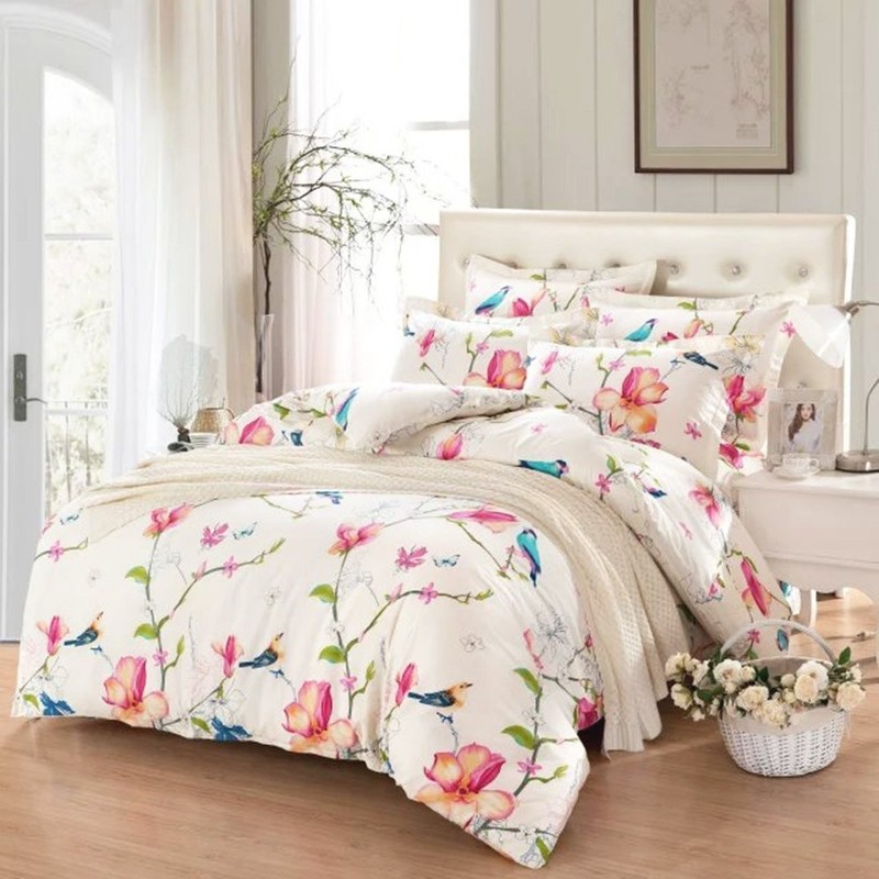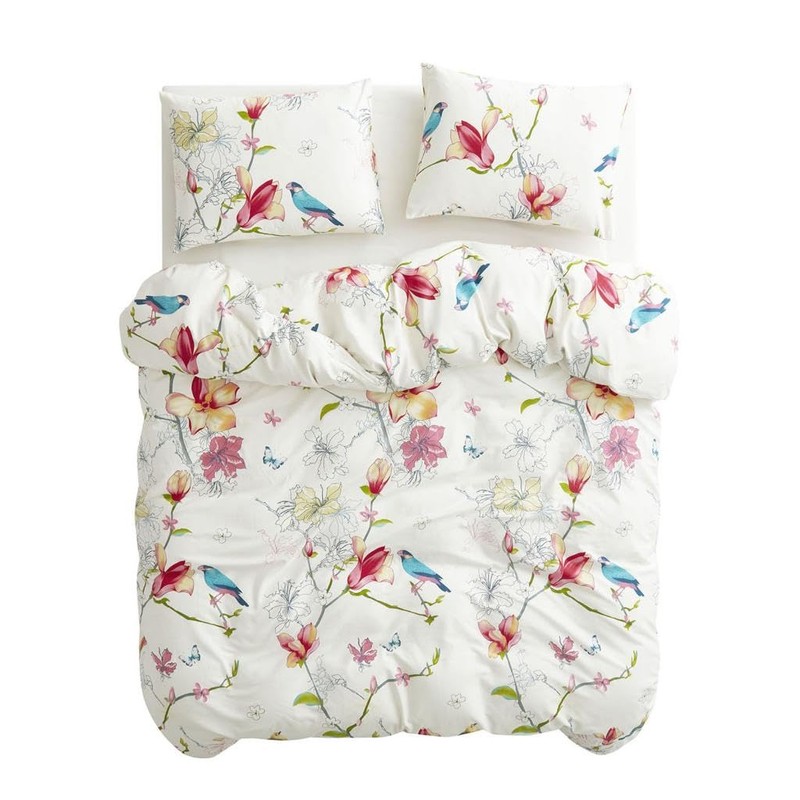 Wake In Cloud - Floral Duvet Cover Set Twin, 100% Soft Cotton Bedding, Birds and Flowers Botanical Pattern Printed, with Zipper Closure (3pcs, Twin Size)