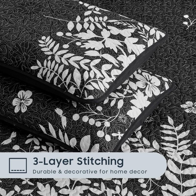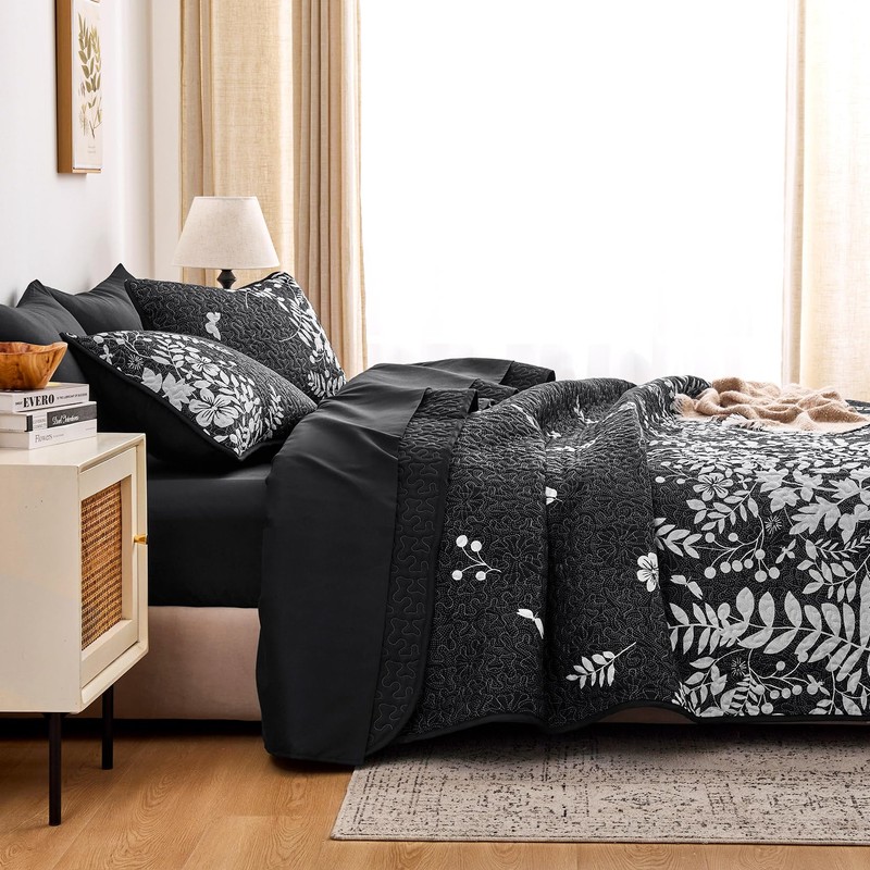 Wake In Cloud - Floral Quilt Set, Botanical Elegant Flower Tree Leaf Modern Pattern Printed, Reversible Lightweight Bedspread Coverlet, 3 Pieces, Black, King Size