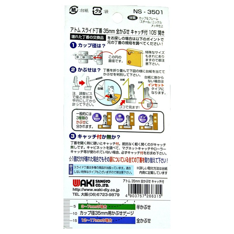 Wake Sangyo ATOM Slide Hinges with Catches, Full Coverage, Cup Diameter 1.4 inches (35 mm), Kitchen, Entryway, Cupboard NS-3501