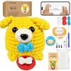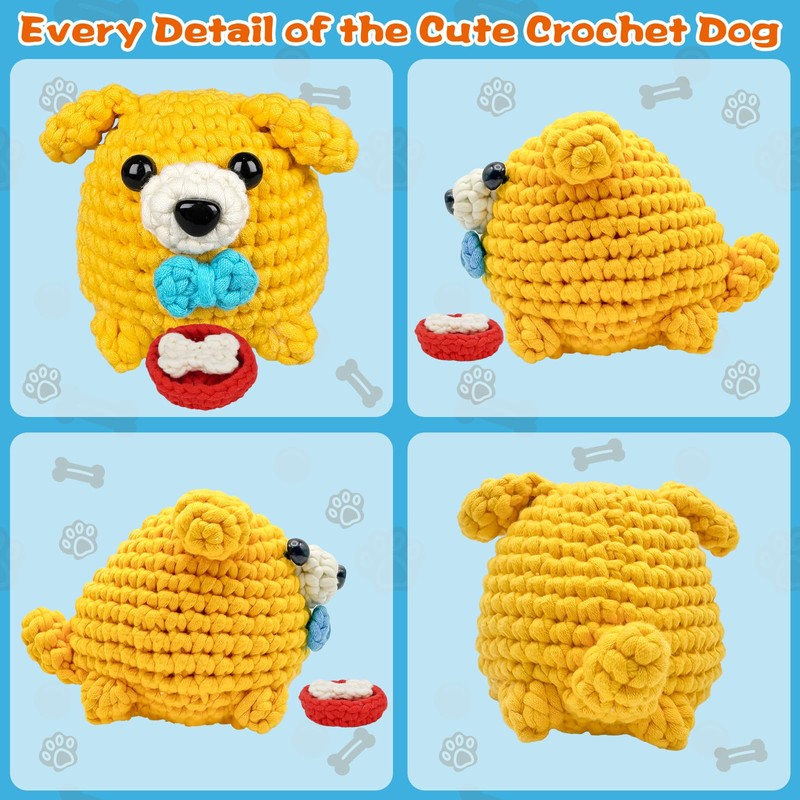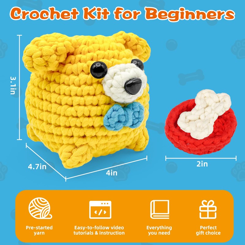- CROCHET KIT FOR COMPLETE BEGINNERS: This all-in-one crochet kit for beginners includes everything you need to create your own adorable dog and accessories, including 40%+ extra high-quality cotton-nylon blend yarn (Yellow, apricot, blue, red), enough fiber fill, a 3.0mm crochet hook, 4 stitch markers, 2 safety eyes, a yarn needle, step-by-step video tutorails and instructions. Perfect crochet kit for beginners kids and adults, it's the ideal learn to crochet kit for crochet starter.