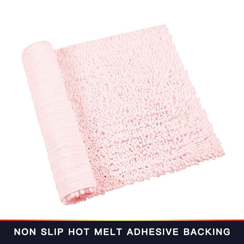 - Non-slip: Skid resistant bottom is made of high quality hot melt. This anti-skid backing keeps bathmat firmly in place to prevent shifting and skidding. It won't slip or slide. Please place the non-skid toilet rug on DRY SMOOTH FLOOR only. Water under the bathroomrug can cause it to slip. Keep bottom of the bath rug dry.