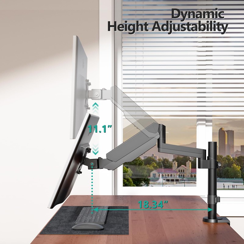 - Fully Adjustable: The gas spring stand can tilt +35°/-35°, swivel +90°/-90°, and rotate 360°. Max height is up to 23.62", and max extension is up to 18.34".