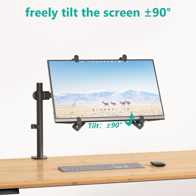 - Adjustment: This single monitor mount offers +/-90° tilt, 360° Rotating, +/-90° Swivel, and height adjustment along the center pole. Bezel height from 10.5” to 16.25”