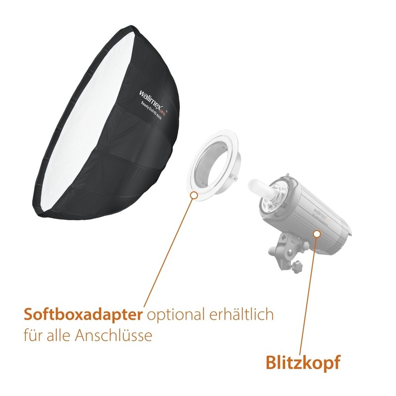 - Connection to all flash systems and flash heads - Here a separately available Walimex pro softbox adapter is simply placed in the speed ring and fixed with the four screws. Softbox adapters are available for a wide range of manufacturers, including Bowens. The softbox is used in all areas of people as well as in product photography.