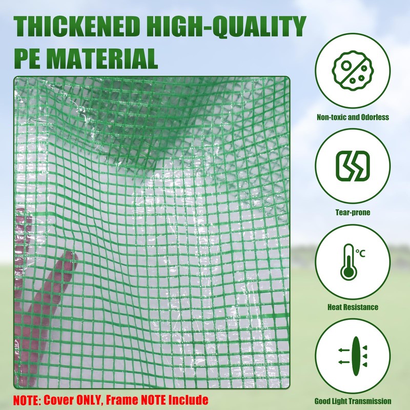 - [𝑫𝒖𝒓𝒂𝒃𝒍𝒆 𝑷𝑬 𝑴𝒂𝒕𝒆𝒓𝒊𝒂𝒍]: Made of high-strength PE material, this greenhouse cover withstand UV damage and all kinds of harsh weather conditions. Its thick construction ensures long-lasting durability and no need to worry about greenhouse deformation, not easy to tear., giving your plants the protection they need
