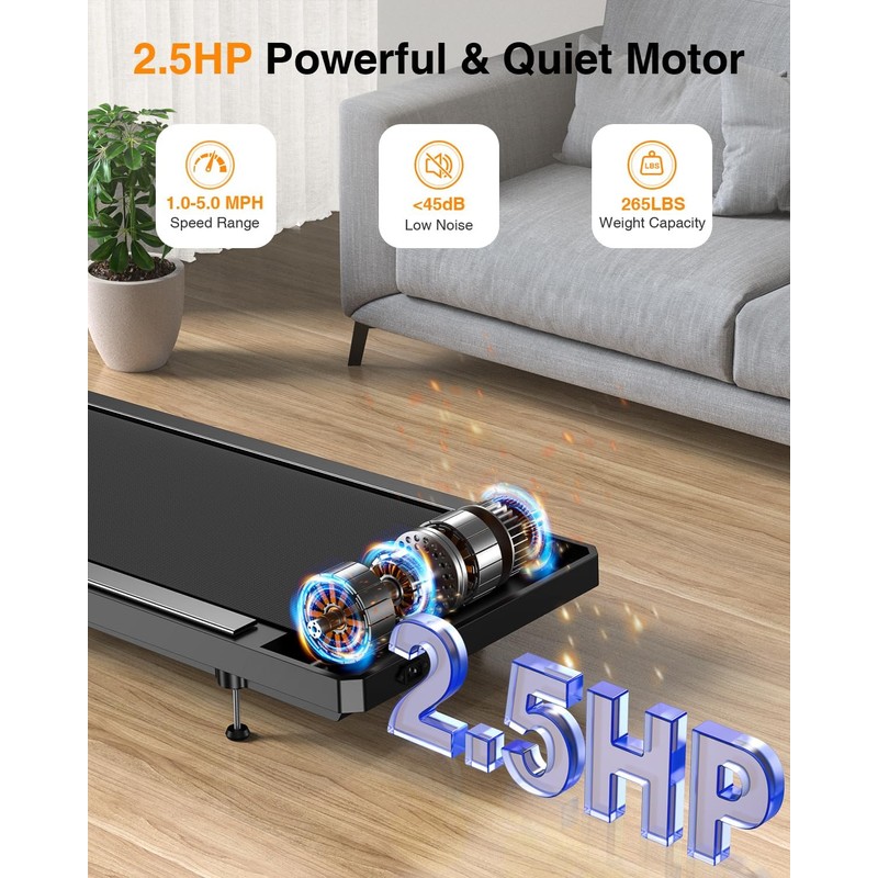- 【Powerful & Quiet Motor】2.5HP motor supports 265 lbs and reaches 5.0 MPH. This walking pad treadmill runs quietly, letting you work out without disturbing family or coworkers.