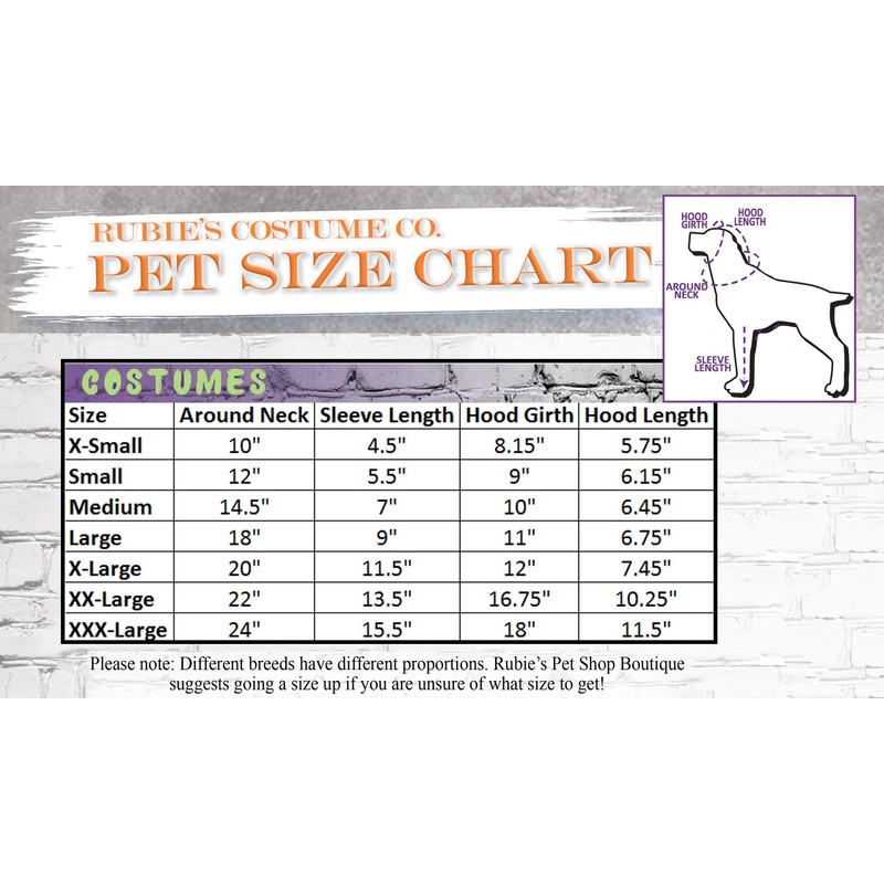 - READ THE RUBIE'S PET SIZE CHART and WATCH THE SIZING INSTRUCTION VIDEO, do not select size based on breed; consider costume style and animal shape before ordering