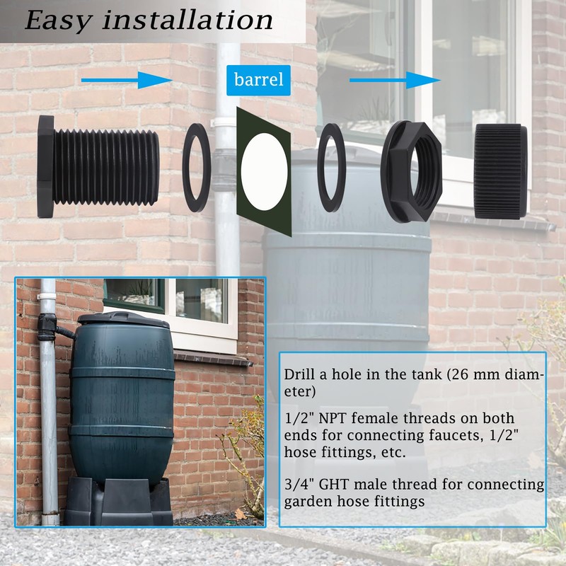 - easy to install: drill a 26mm diameter hole in the tank, pass the bulkhead through the hole in the rain barrel, and finally tighten the lock nut for a quick and easy installation. Verify dimensions before drilling to ensure a perfect fit.