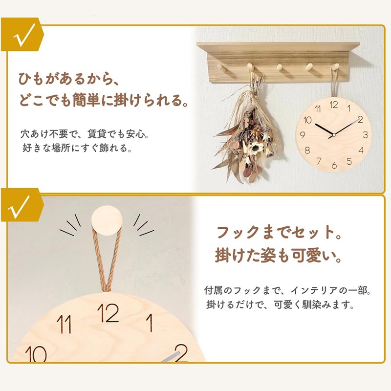 • 【天然無垢材のぬくもり】文字盤、針ともに天然の無垢材を使用しているので、木目プリントでは出せない、天然木の質感やぬくもりを感じる壁掛け時計です。