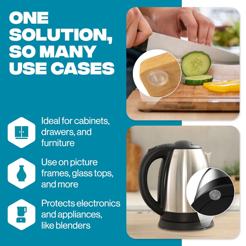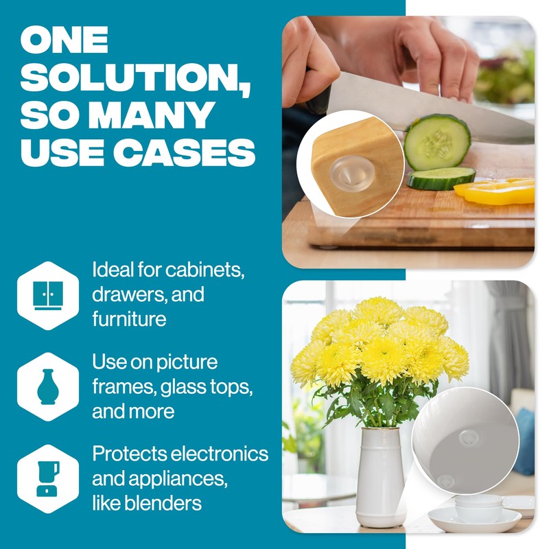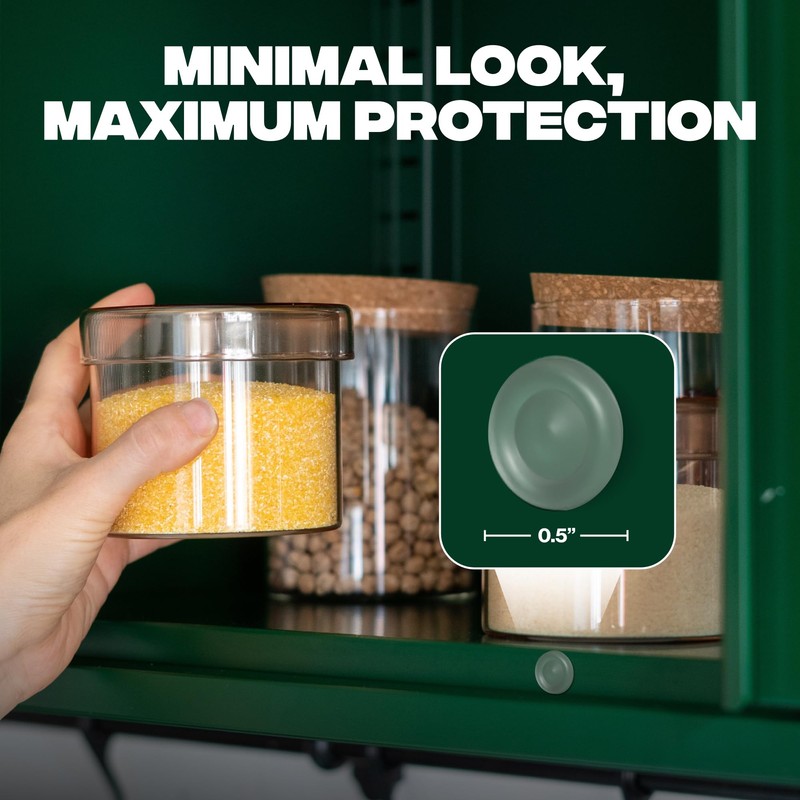 • Clear and almost invisible protection - These cabinet door buffers are transparent and allow the wall paint to shine through. The clear colour is designed to blend with different wall colours, and the clear rubber buffers blend seamlessly into the furniture, so that the aesthetics of your interior are preserved while avoiding noise and damage. These cabinet buffers also provide discreet protection for glass tabletops, cutting boards and picture frames.