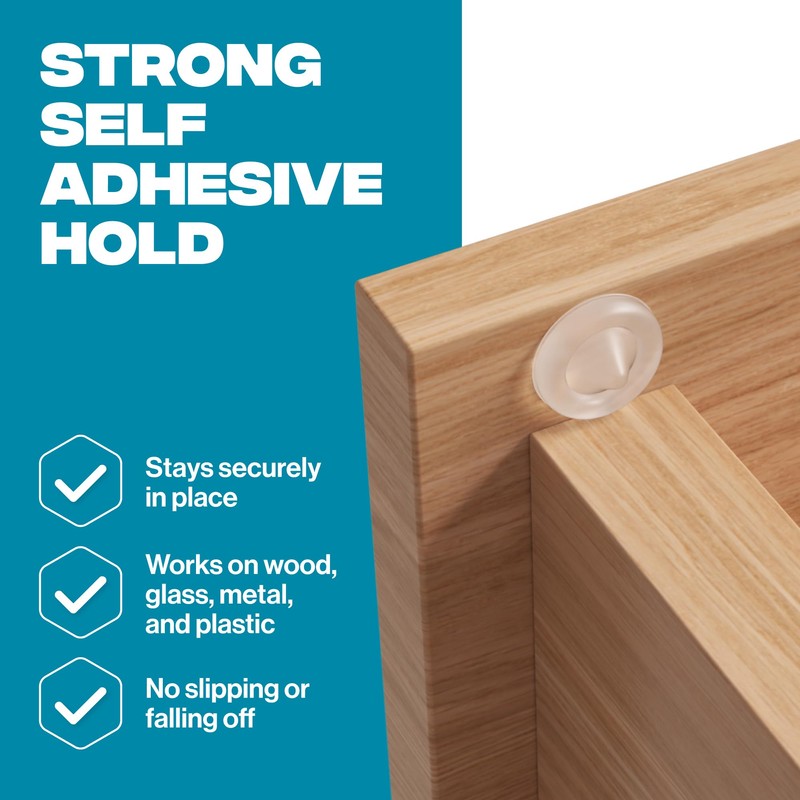 • STRONG SELF ADHESIVE - With their ultra-sticky backing, these clear cabinet buffers are easy to apply and stick firmly to kitchen cabinets, drawers and furniture surfaces. The clear adhesive pads do not slip or wear off and provide reliable protection.