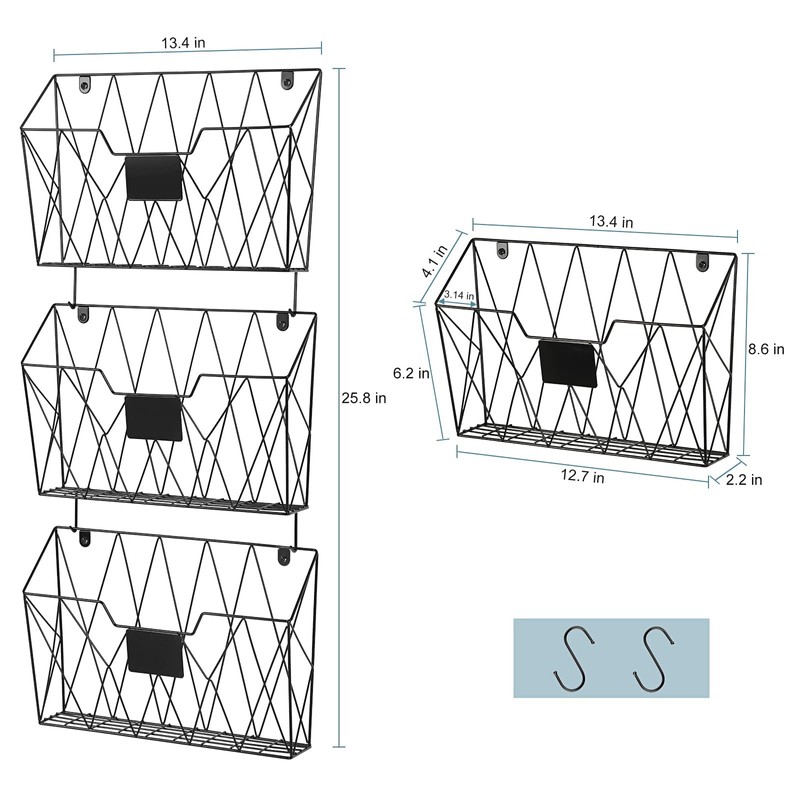 • 【Wall File Organizer 3 Pockets】Single Dimensions is 13.4" L x 3.4" W x 8.6" H. The basket with hooks can be mounted together or separately to satisfy your different needs. Wall file holder is made by metal materials. Metal wire design makes it more durable and sturdy compared with plastic products.