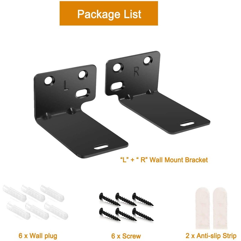 - Package list ----- 2 x sound bar wall mounts, 6 x screws, 6 x wall plugs, 2 x sticky anti-slip strips
