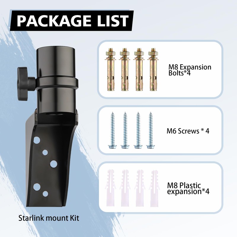- Easy to install: The Starlink installation kit is easy to operate and includes M8 metal expansion * 4, M6 screws * 4, M8 plastic expansion * 4, suitable for various walls. The evenly distributed screw holes can disperse the weight of the Starlink V2 disc heavy-duty pole bracket, improve stability, and prevent shaking or movement problems
