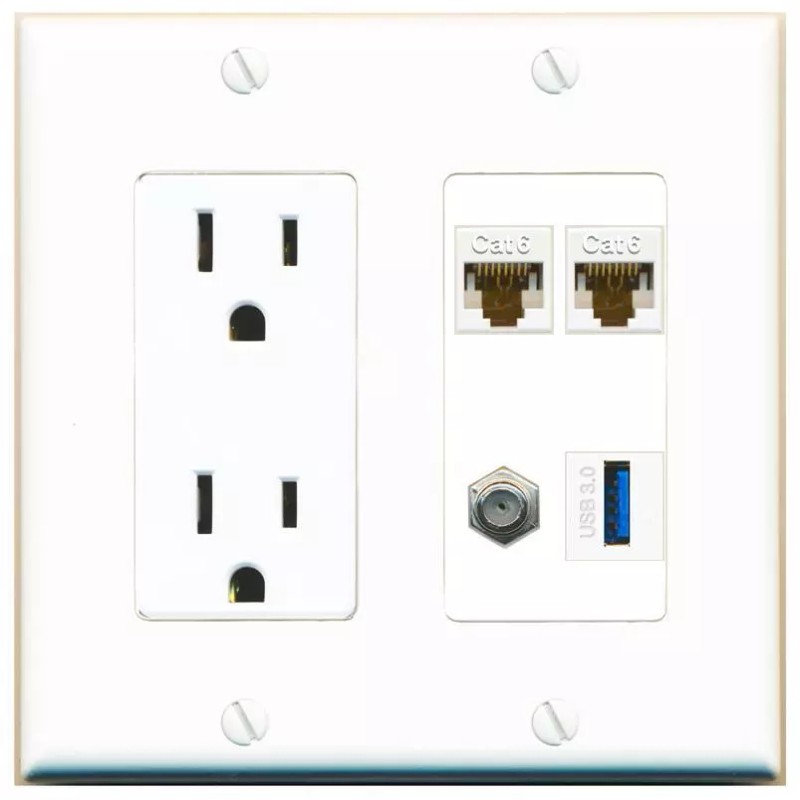 Wall Plate City 2 CAT6 COAX USB-3 Port Wall Plate w/Power Outlet White