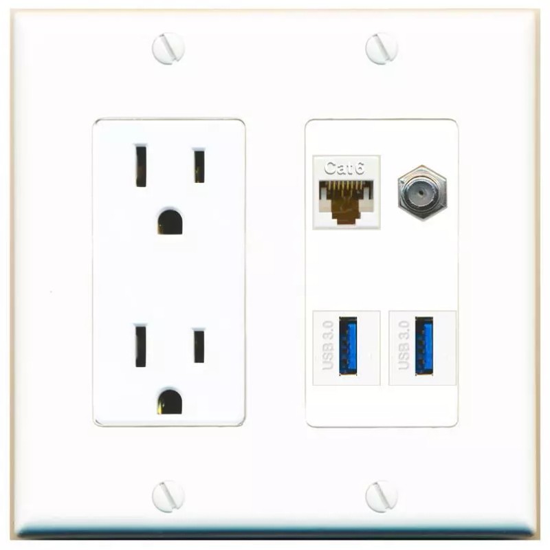 Wall Plate City CAT6 COAX 2 USB-3 Port Wall Plate w/Power Outlet White