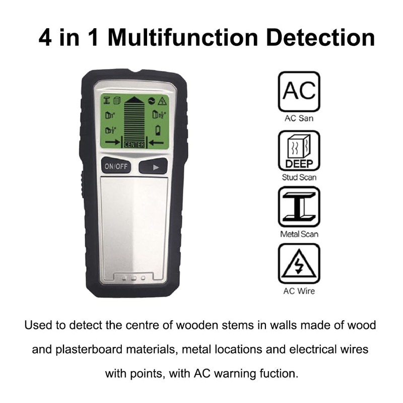 - Comfort and convenience: our wall scanner combines four functions in one unit. It can be used to detect the center of wood studs in walls made of wood and plasterboard, locate metal, and identify electrical wires, with an AC warning function for added safety.