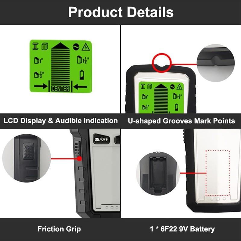 - LCD Display & Acoustic Display Get instant insights from a vibrant LCD display that displays detection mode, signal strength, auto calibration, battery life and more. The large LCD display, combined with a clear beep, helps you find the exact bolt center and edges.