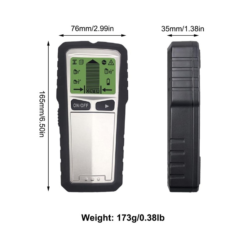 - Three measurement modes: the three measuring modes offer different measuring ranges. The stud scan locates the center and edges of wood and metal studs at depths of 13mm, 25mm and 38mm. The metal scan detects metal up to 60mm deep, and the AC scan detects live unshielded AC lines up to 51mm deep.