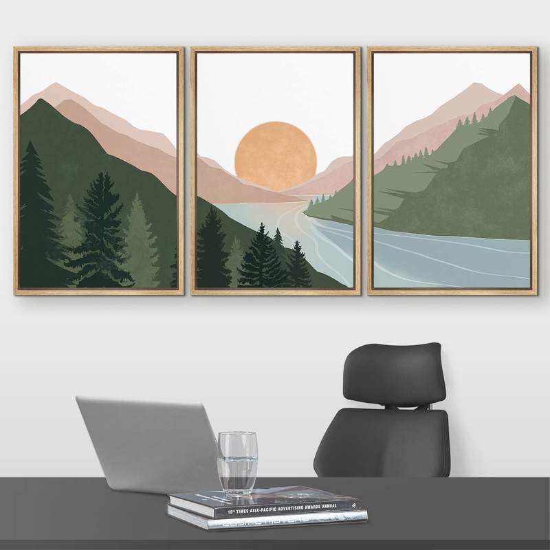 wall26 Framed Canvas Print Wall Art Set Mountain Range Pine Forest Lake Abstract Nature Illustrations Modern Art Nordic Decorative Minimal Boho for Living Room, Bedroom, Office - 16"x24"x3 Natural